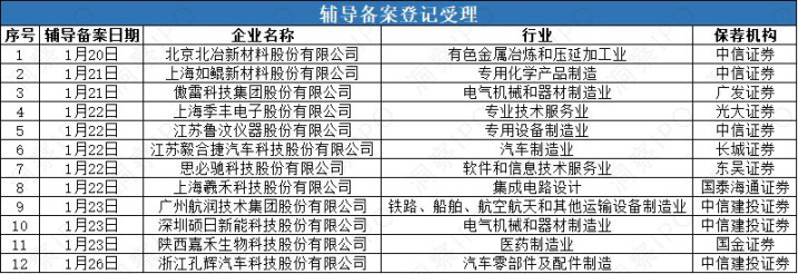 1月20日-1月26日,有12家公司境内(沪深两市)发行上市辅导备案登记获受理。