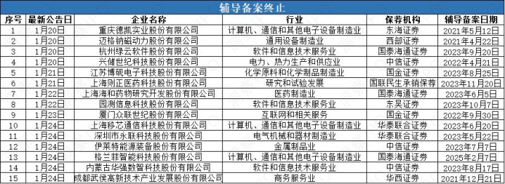 1月20日-1月26日,有15家公司境内(沪深两市)发行上市辅导备案终止。